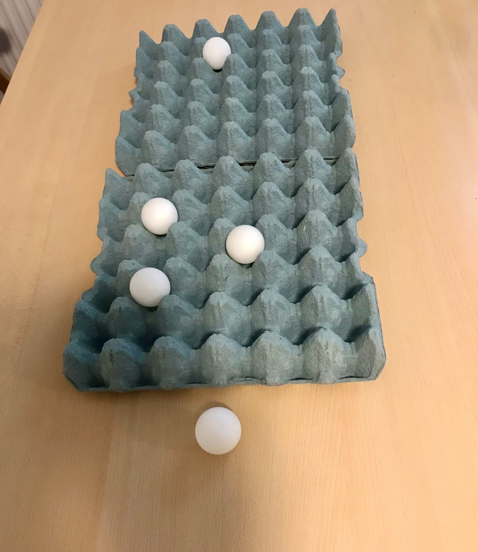 Bei diesem Spiel geht es darum, die Tischtennisbälle in die Eierkartons hüpfen zu lassen. Je weiter der Ball in den hinteren Reihen landet, umso mehr Punkte erhält der Spieler.