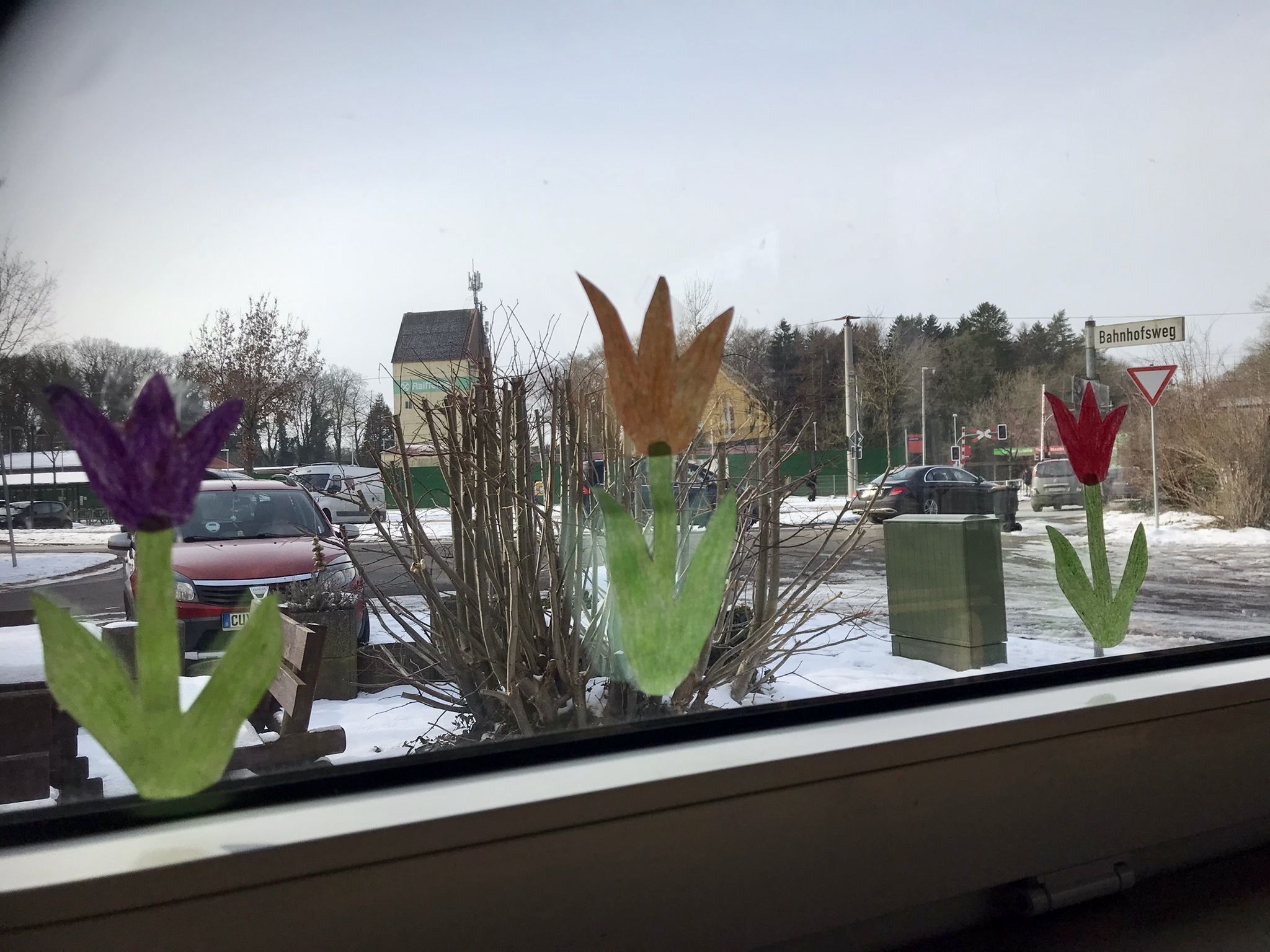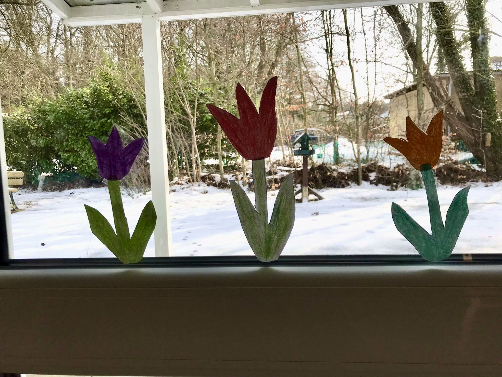 Aus weißem Tonpapier wurden Tulpenrohlinge geschnitten, diese wurden dann bunt bemalt. Die fertigen Tulpen fanden dann ihren Platz in den Fenstern unserer Einrichtung.